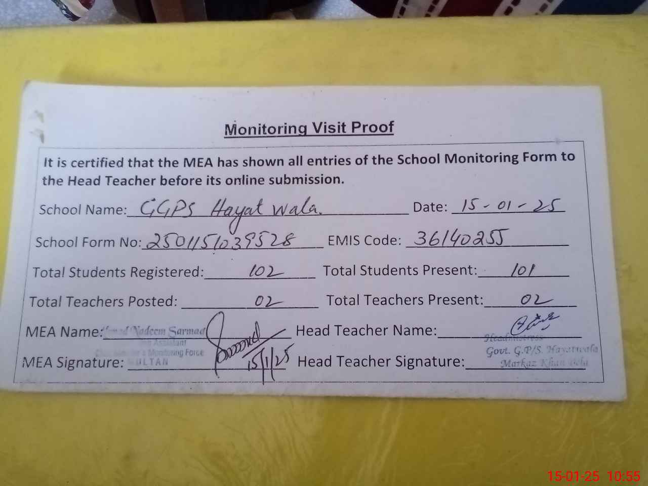 | EMIS Code: 36140255 | Name of School: GGPS HAYAT WALA | |||