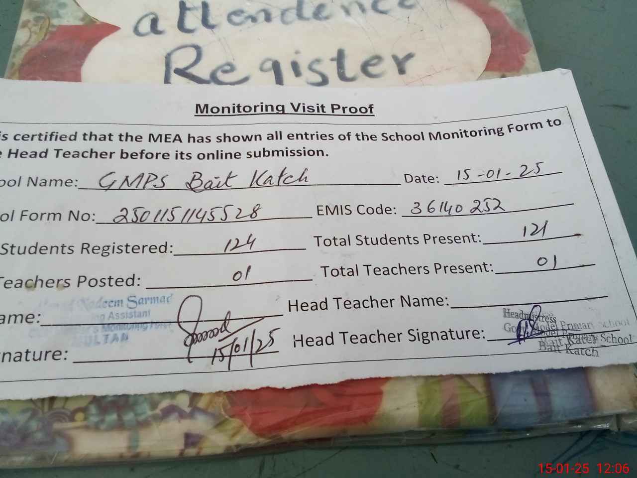 | Attendance Register | Head Teacher | MEA with School | Visit Proof |