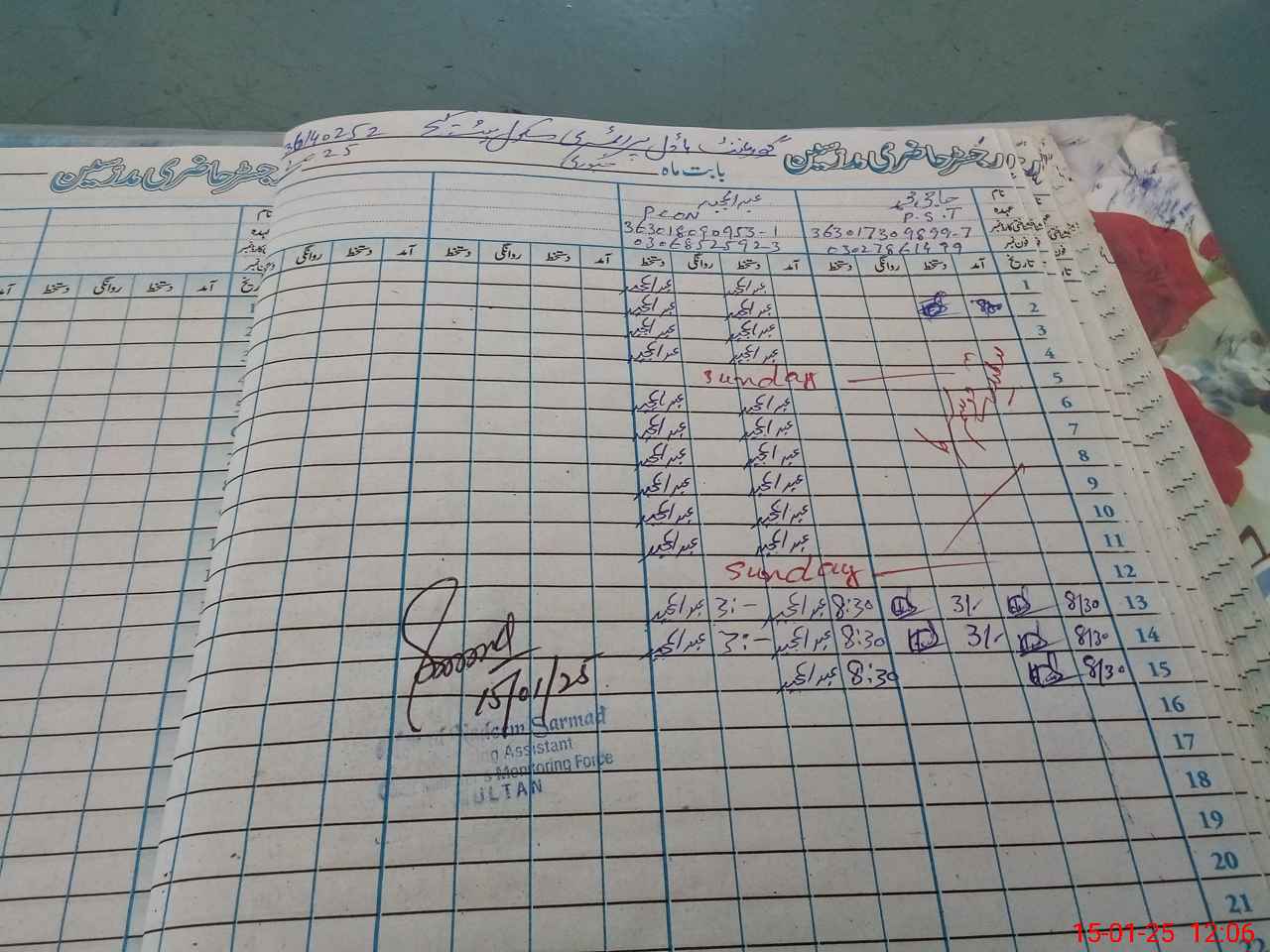 | CNIC | Full Name | Designation | R/C | Absence during last cal. month |