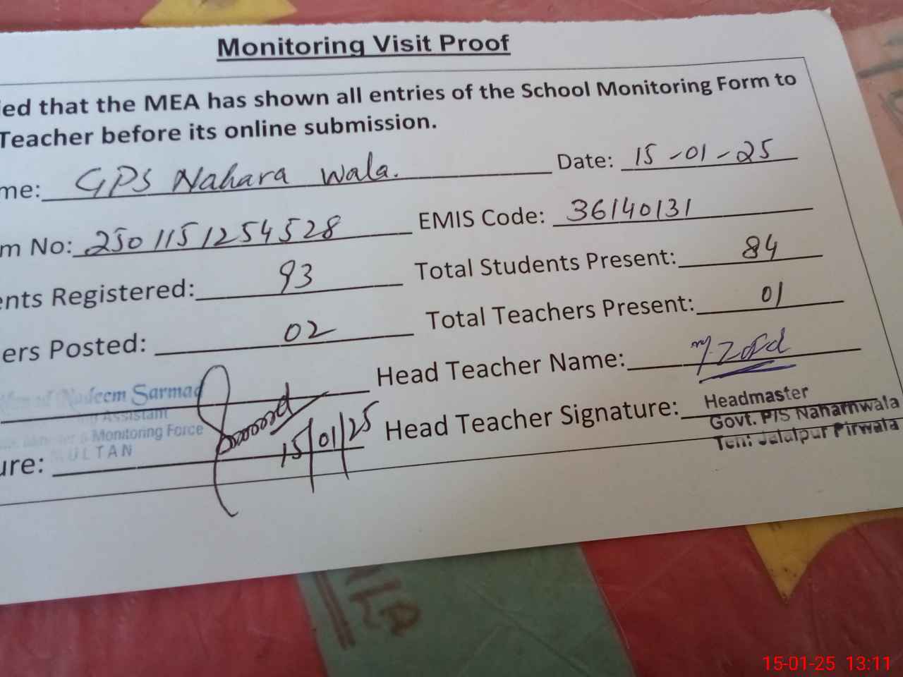 | Attendance Register | Head Teacher | MEA with School | Visit Proof |