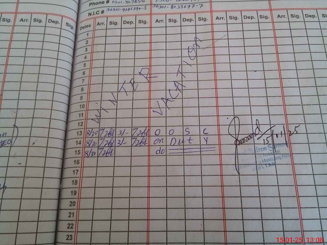 | CNIC | Full Name | Designation | R/C | Absence during last cal. month |