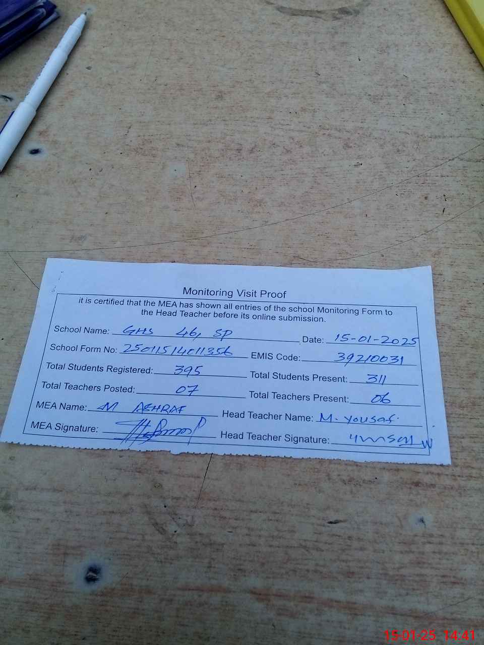 | Attendance Register | Head Teacher | MEA with School | Visit Proof |