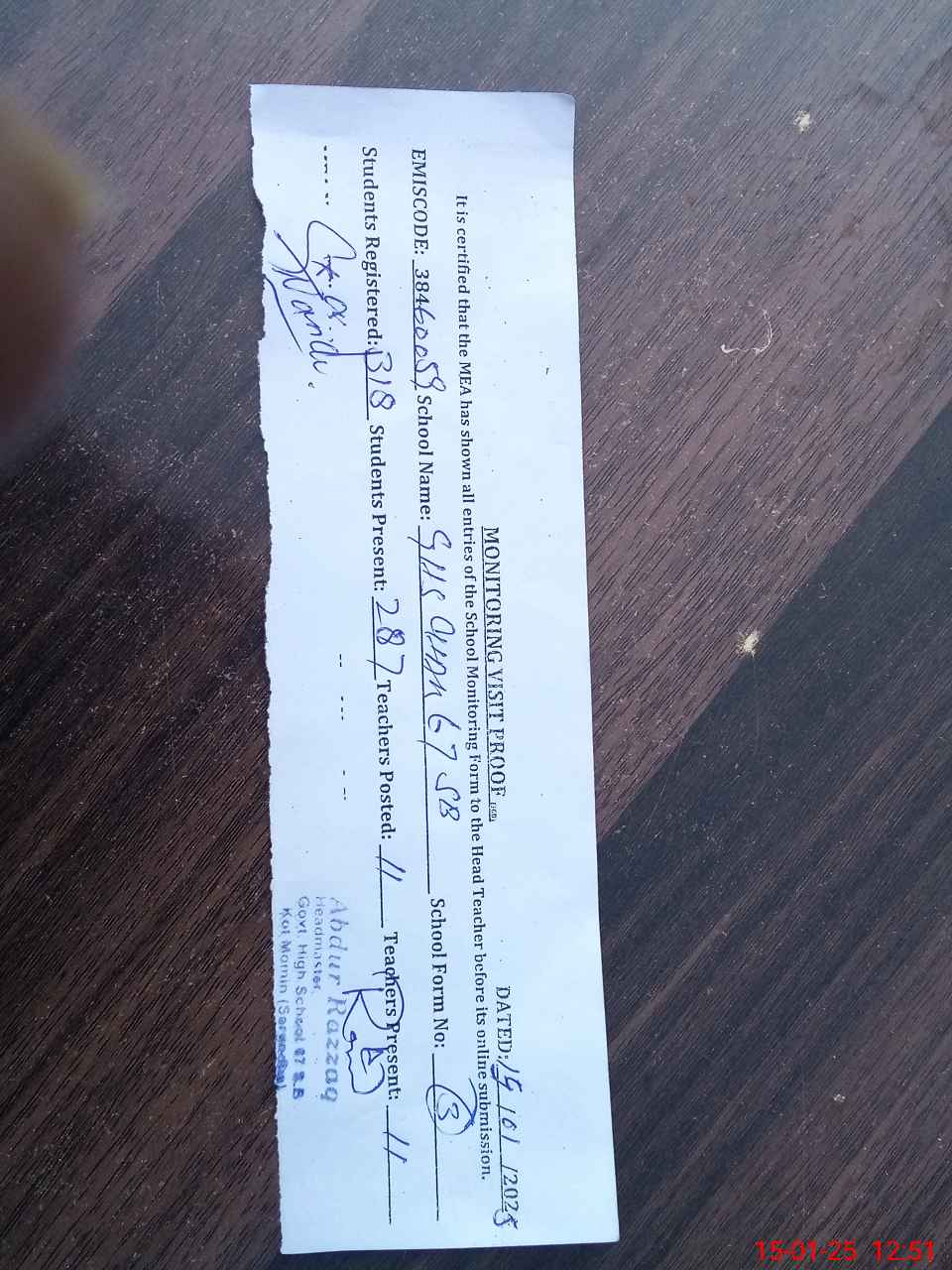 | Name: GU**** AB**** Designation: (School Headmaster's/Headmistress's) HEADMASTER Phone/Cell Number: 03**** |