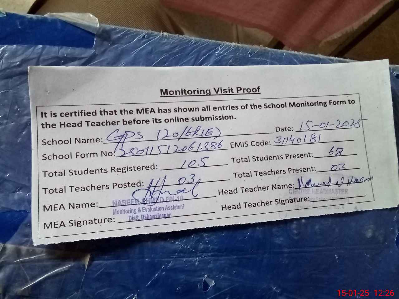 | EMIS Code: 31140181 | Name of School: GPS CHAK NO 120/6-R (E) | |||
