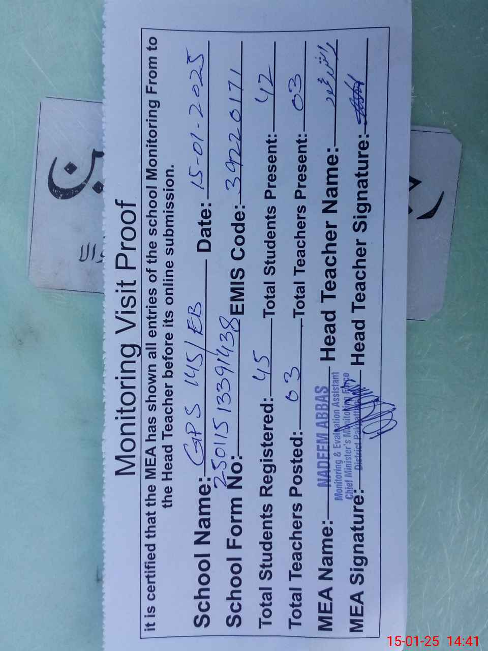 | Attendance Register | Head Teacher | MEA with School | Visit Proof |