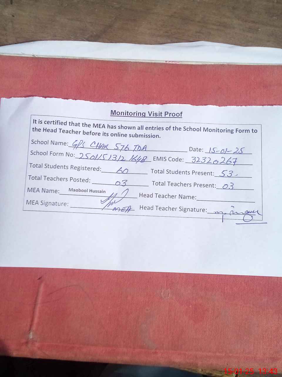 | Attendance Register | Head Teacher | MEA with School | Visit Proof |