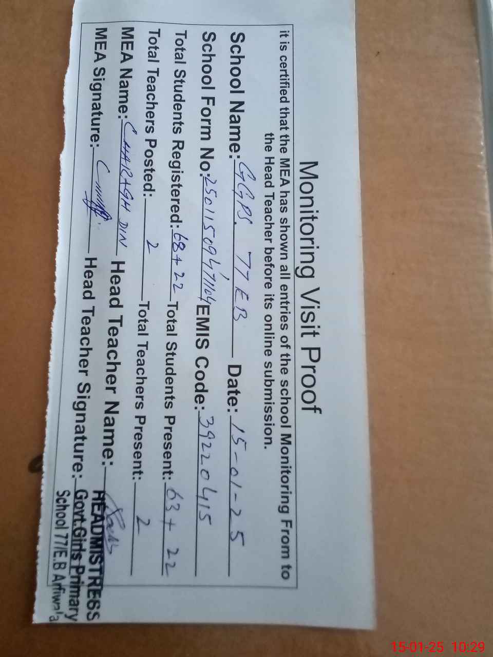 | Attendance Register | Head Teacher | MEA with School | Visit Proof |