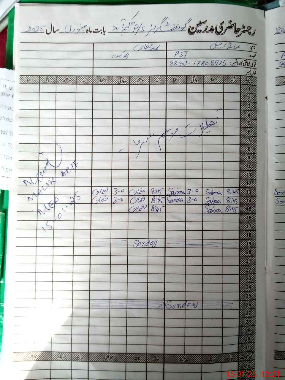 | Name: Ze**** Bi**** Designation: (School Headmaster's/Headmistress's) PST Phone/Cell Number: 03**** |