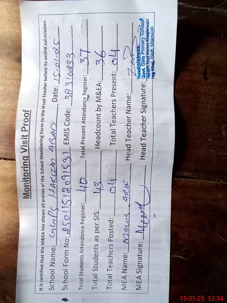 | Attendance Register | Head Teacher | MEA with School | Visit Proof |