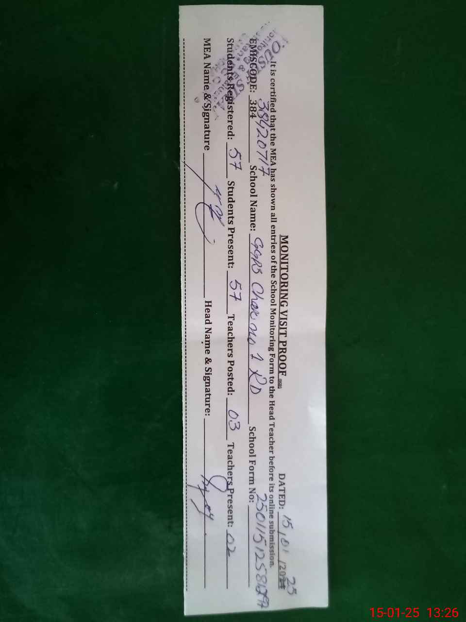| Attendance Register | Head Teacher | MEA with School | Visit Proof |