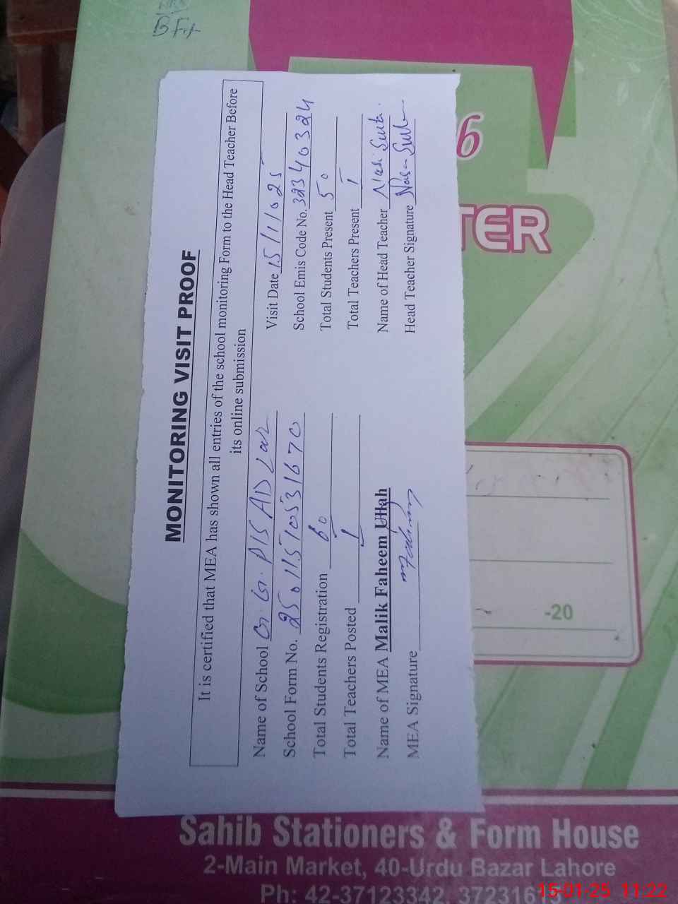 | Attendance Register | Head Teacher | MEA with School | Visit Proof |
