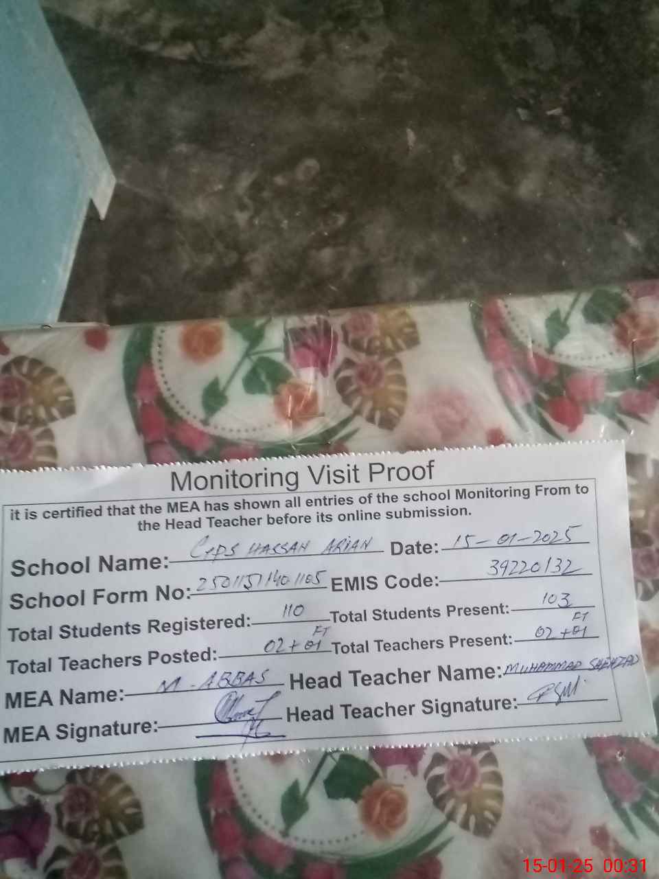 | Attendance Register | Head Teacher | MEA with School | Visit Proof |