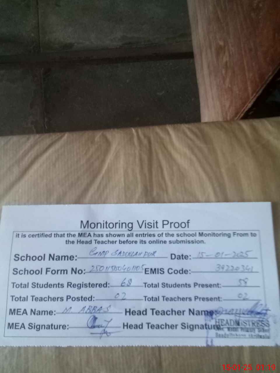 | Attendance Register | Head Teacher | MEA with School | Visit Proof |