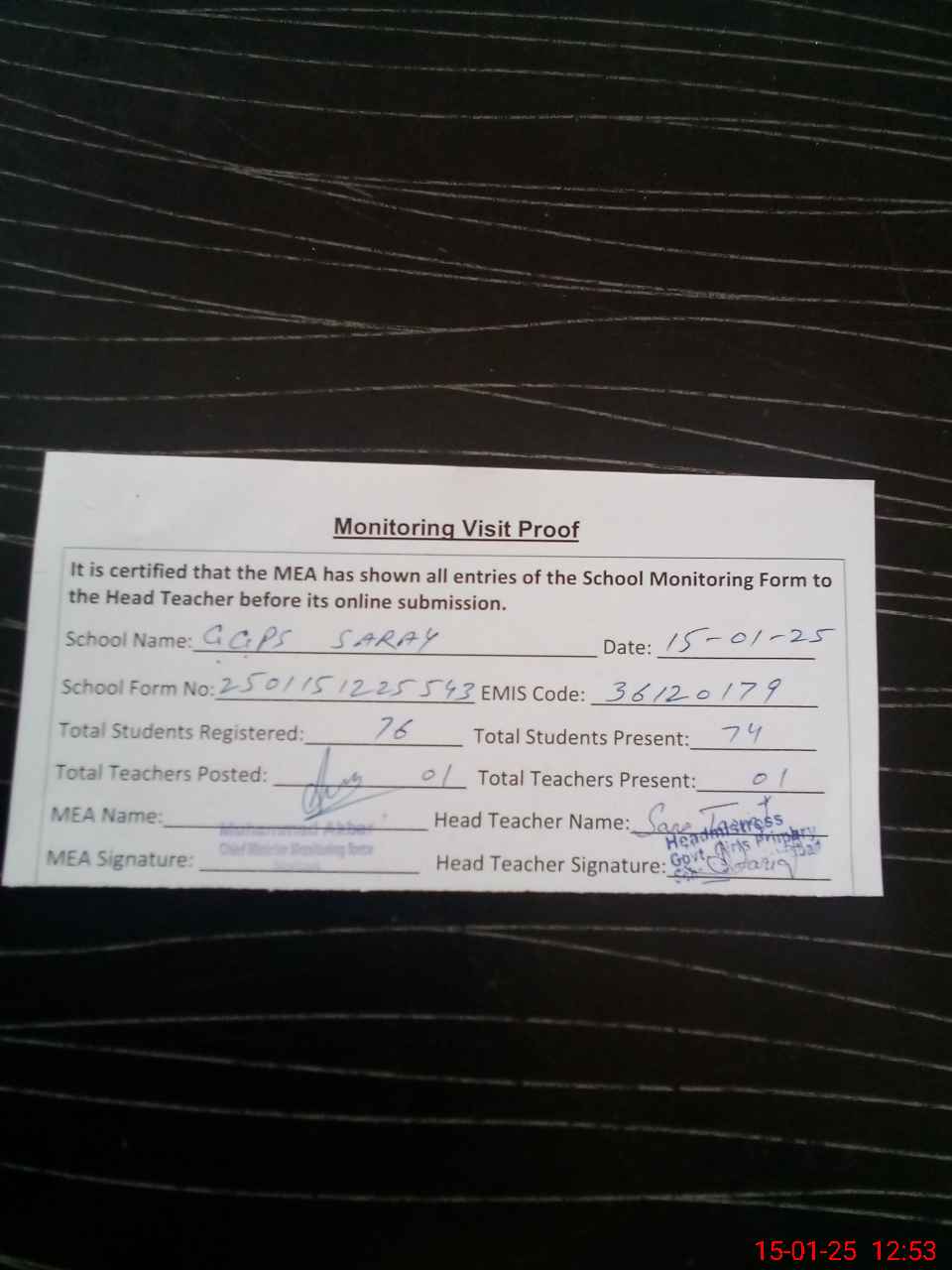 | Attendance Register | Head Teacher | MEA with School | Visit Proof |