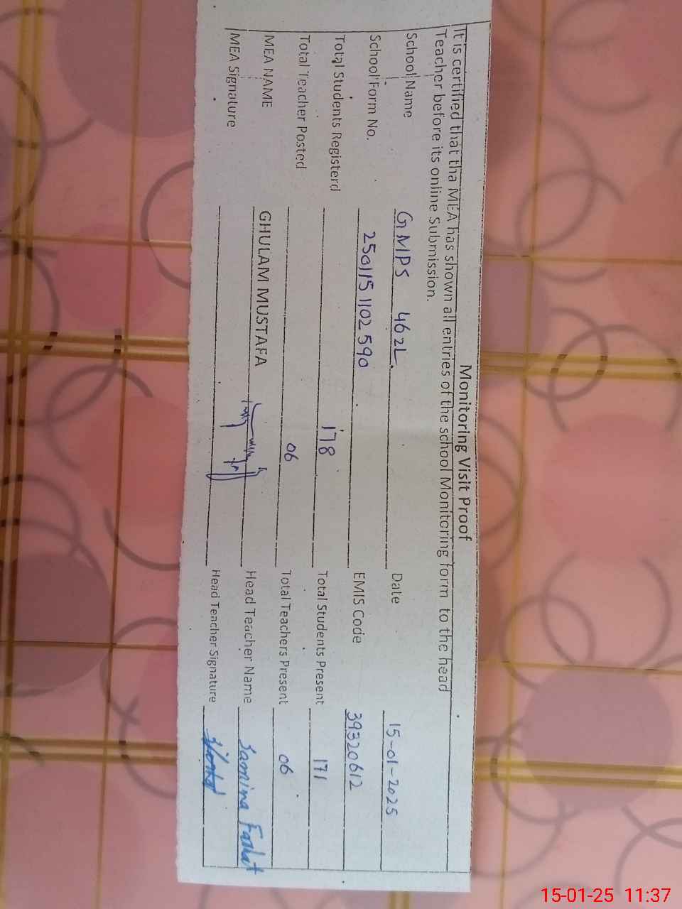 | Attendance Register | Head Teacher | MEA with School | Visit Proof |