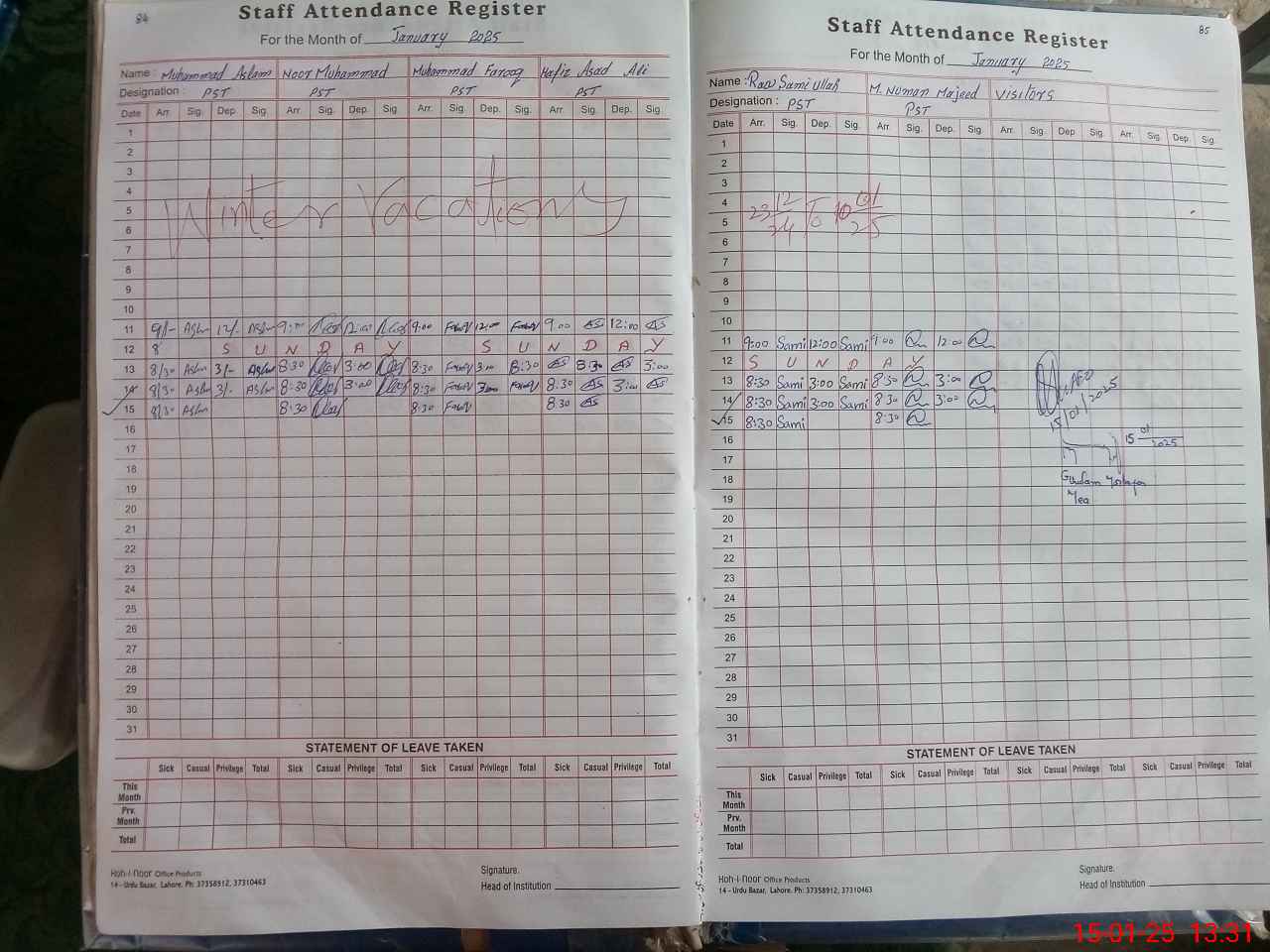 | CNIC | Full Name | Designation | R/C | Absence During Last Calender Month |