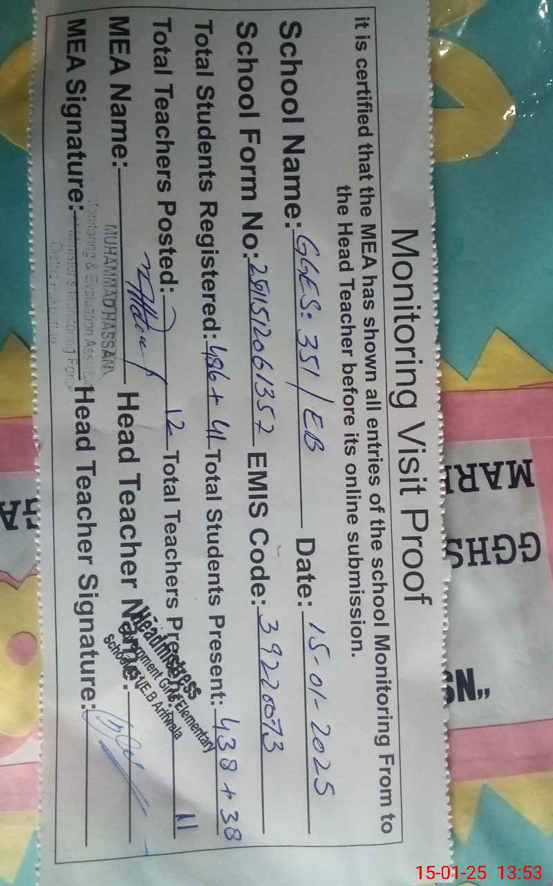 | Certified that this School was Inspected by the Undersigned MEA/DMO Today and the Information Stated Above is as Per Record. | |||||