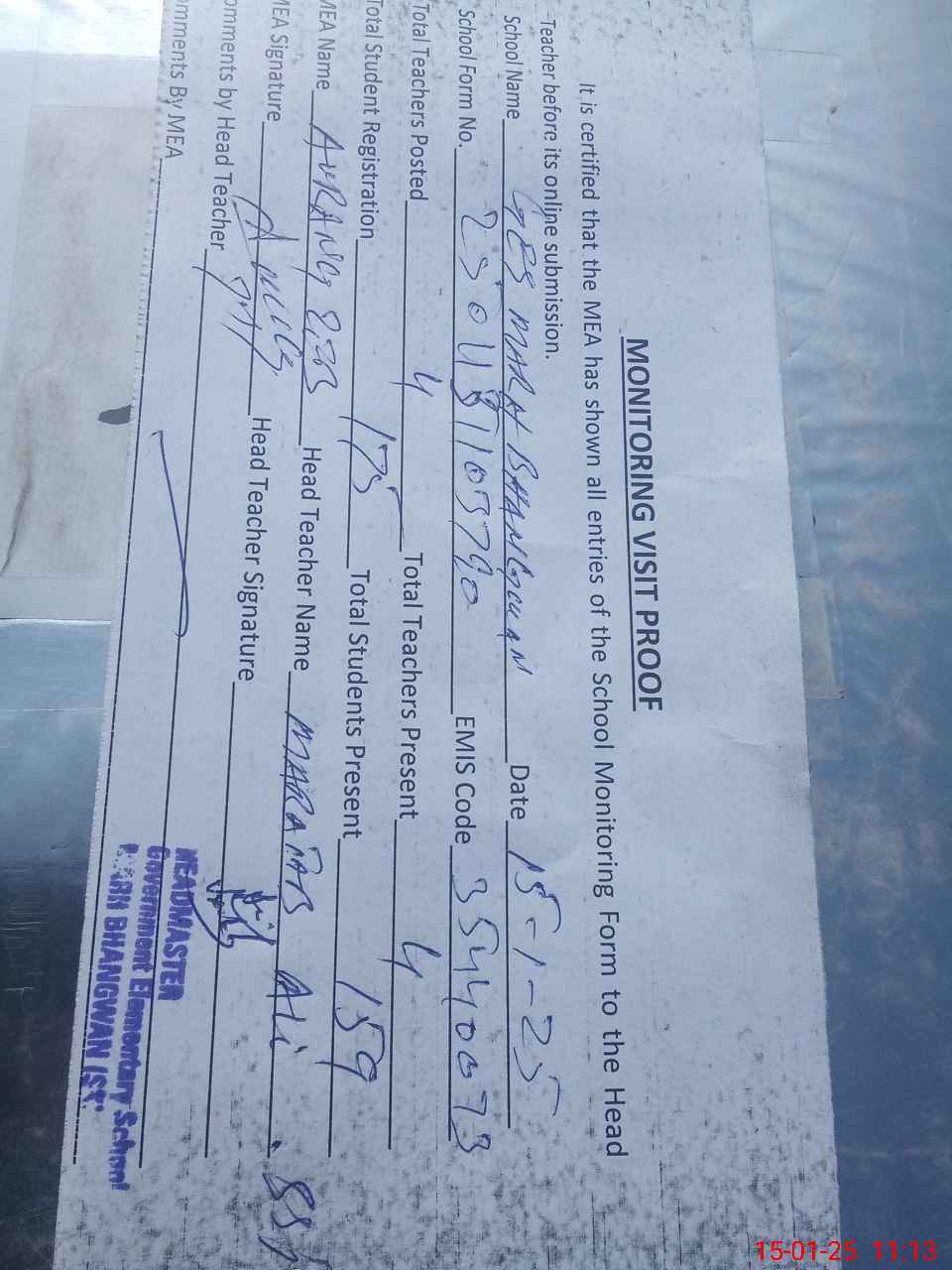 | Attendance Register | Head Teacher | MEA with School | Visit Proof |