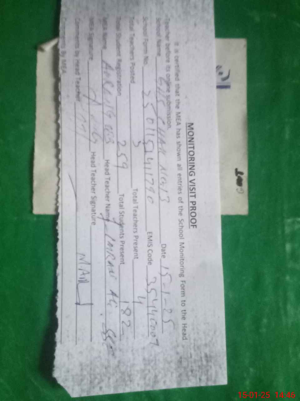 | Attendance Register | Head Teacher | MEA with School | Visit Proof |