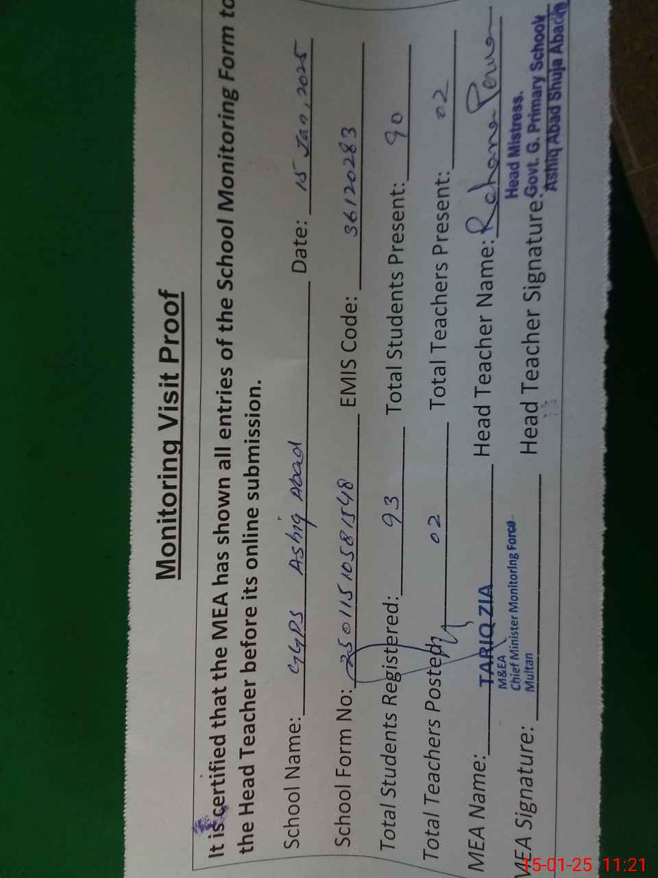 | Attendance Register | Head Teacher | MEA with School | Visit Proof |