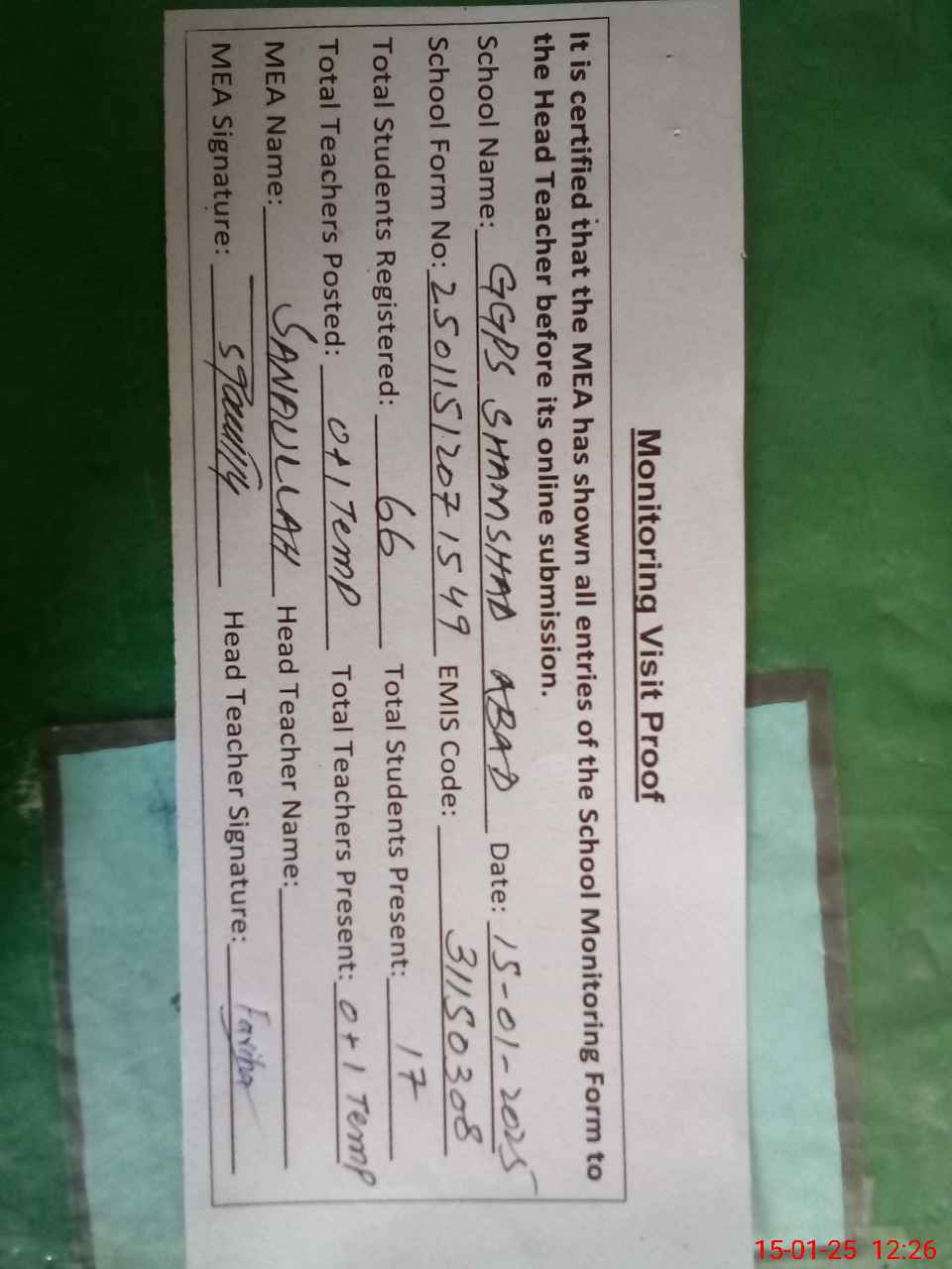 | Attendance Register | Head Teacher | MEA with School | Visit Proof |