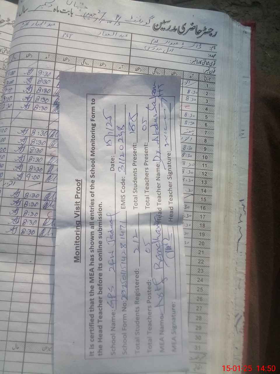 | Attendance Register | Head Teacher | MEA with School | Visit Proof |