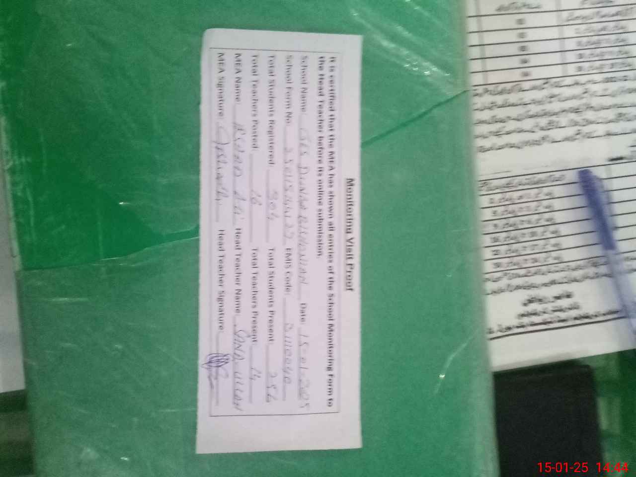 | Attendance Register | Head Teacher | MEA with School | Visit Proof |
