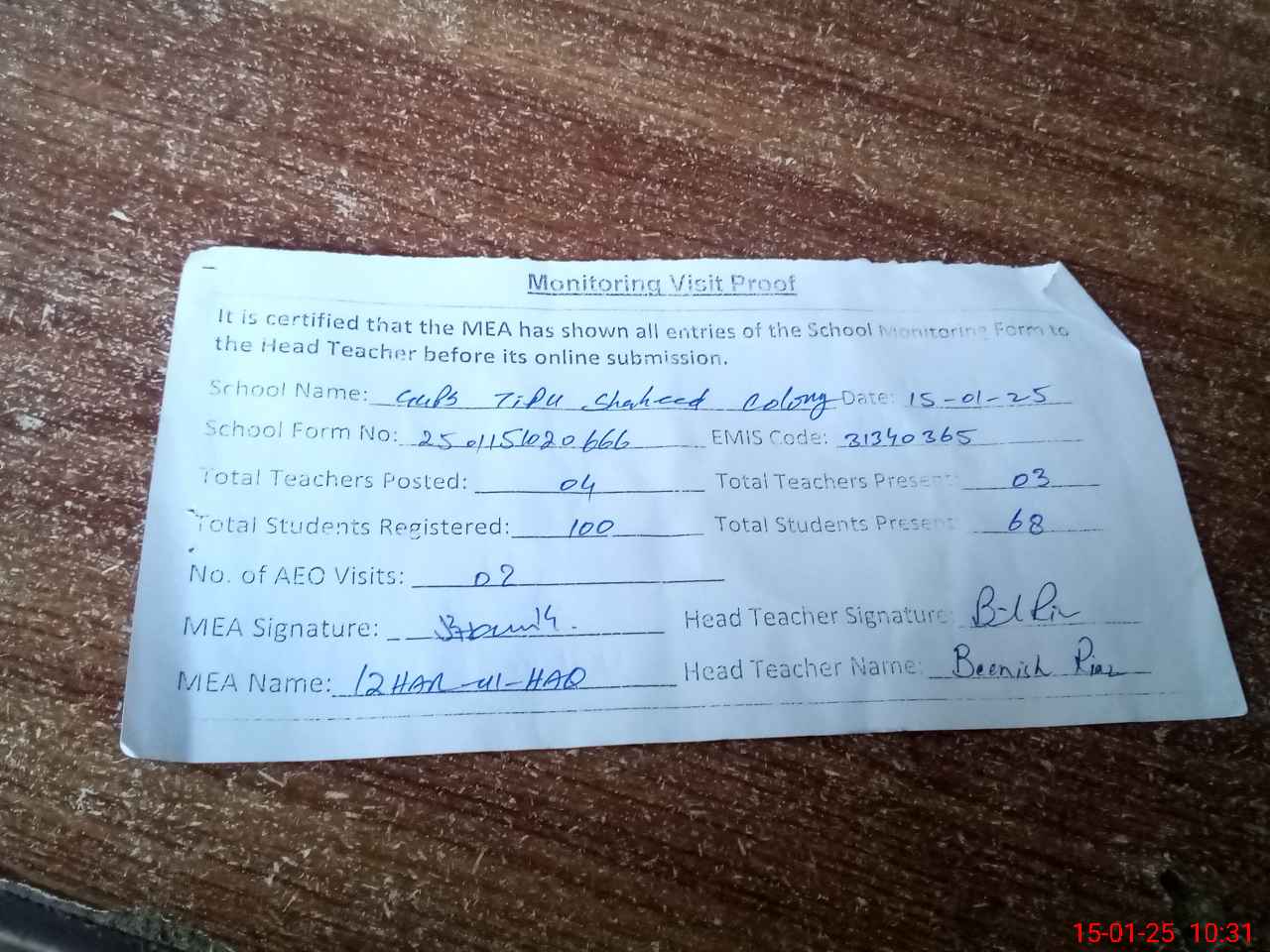 | Attendance Register | Head Teacher | MEA with School | Visit Proof |