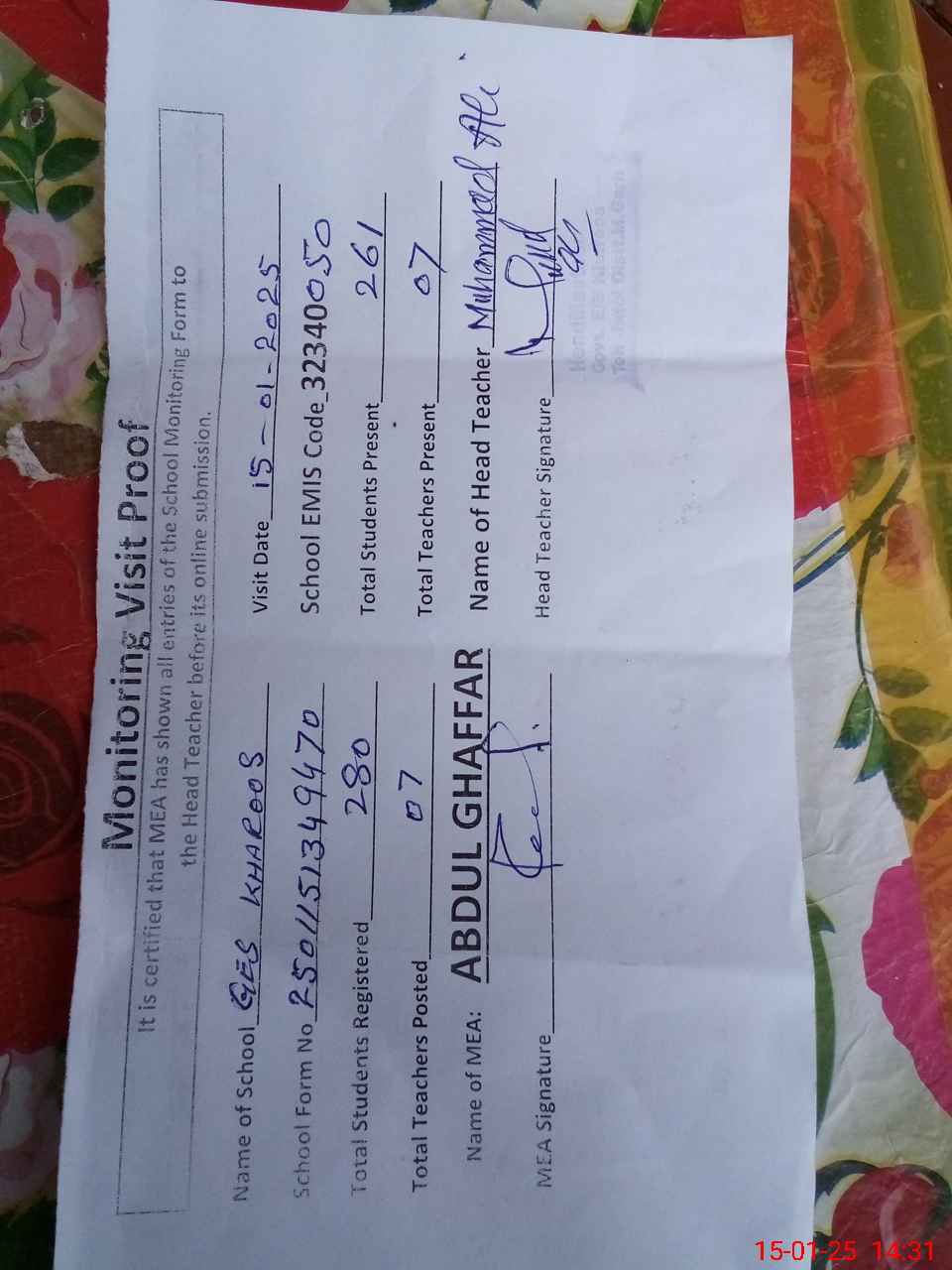 | Attendance Register | Head Teacher | MEA with School | Visit Proof |