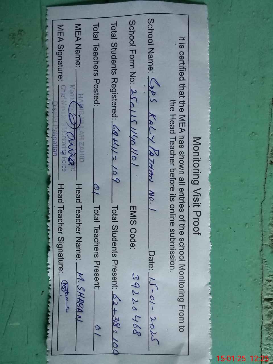 | Attendance Register | Head Teacher | MEA with School | Visit Proof |