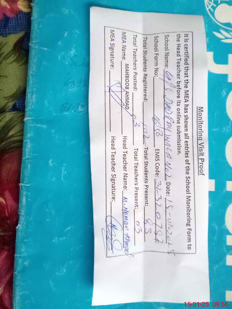 | Attendance Register | Head Teacher | MEA with School | Visit Proof |