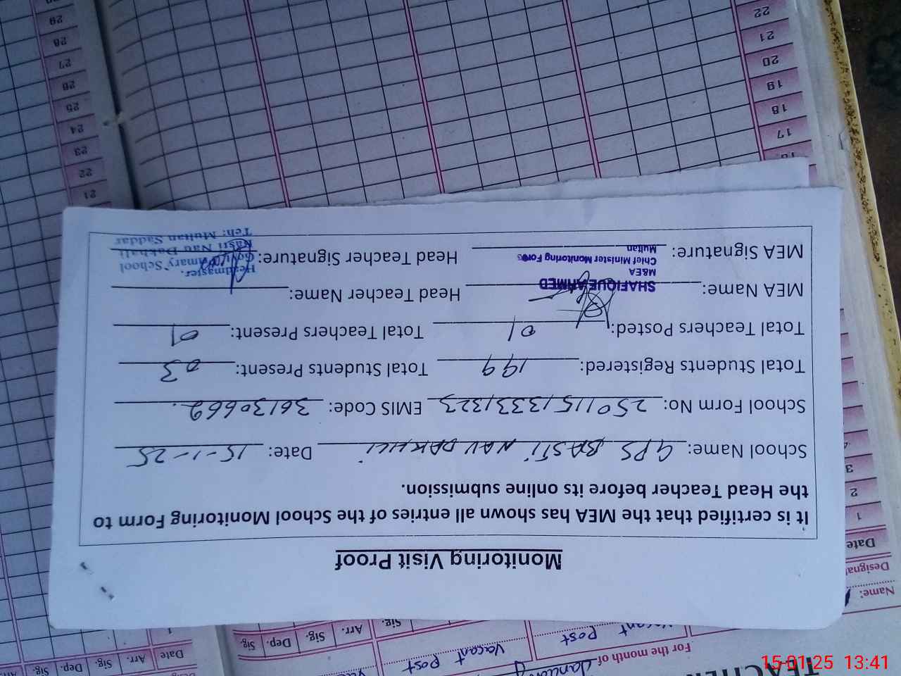 | Attendance Register | Head Teacher | MEA with School | Visit Proof |