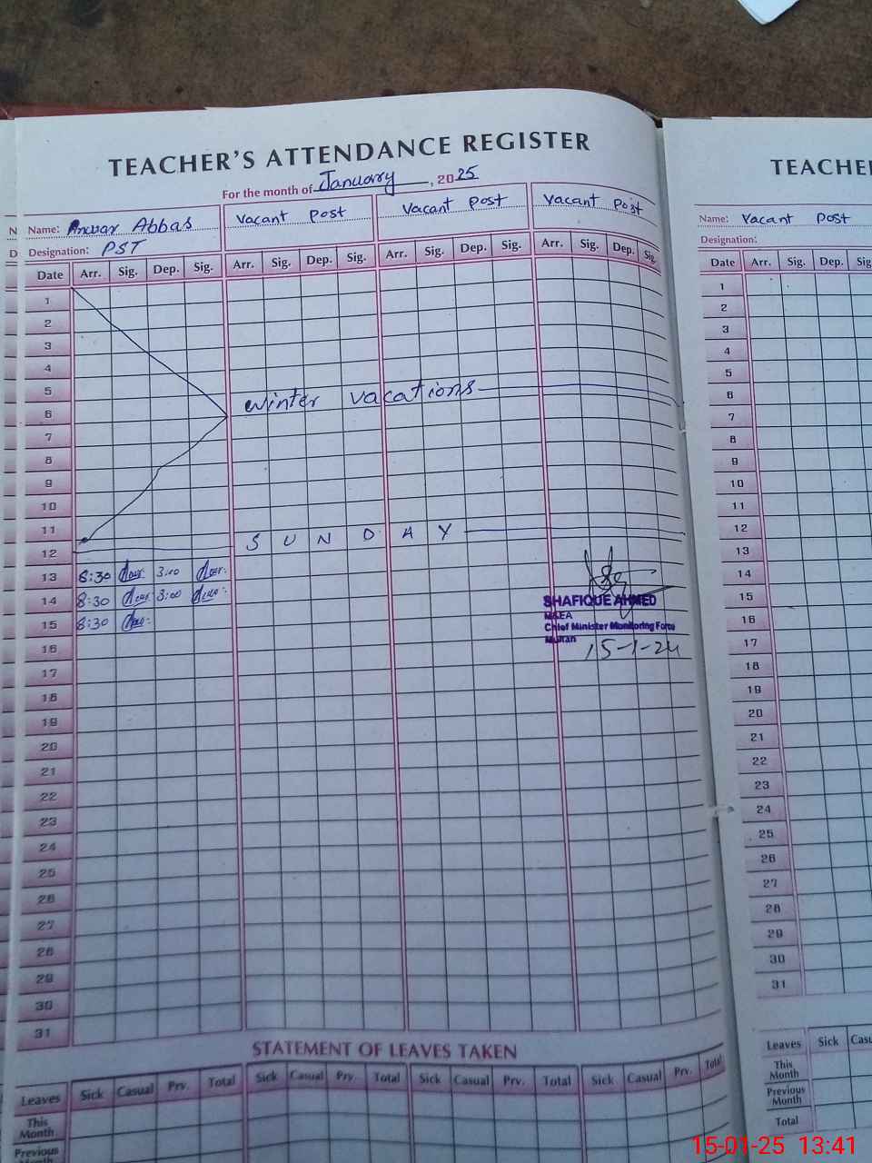 | CNIC | Full Name | Designation | R/C | Absence During Last Calender Month |