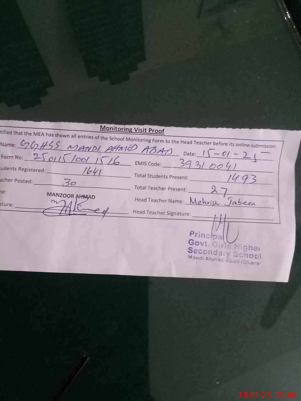 | Name: ME**** Ja**** Designation: (School Headmaster's/Headmistress's) PRINCIPAL Phone/Cell Number: 03**** |
