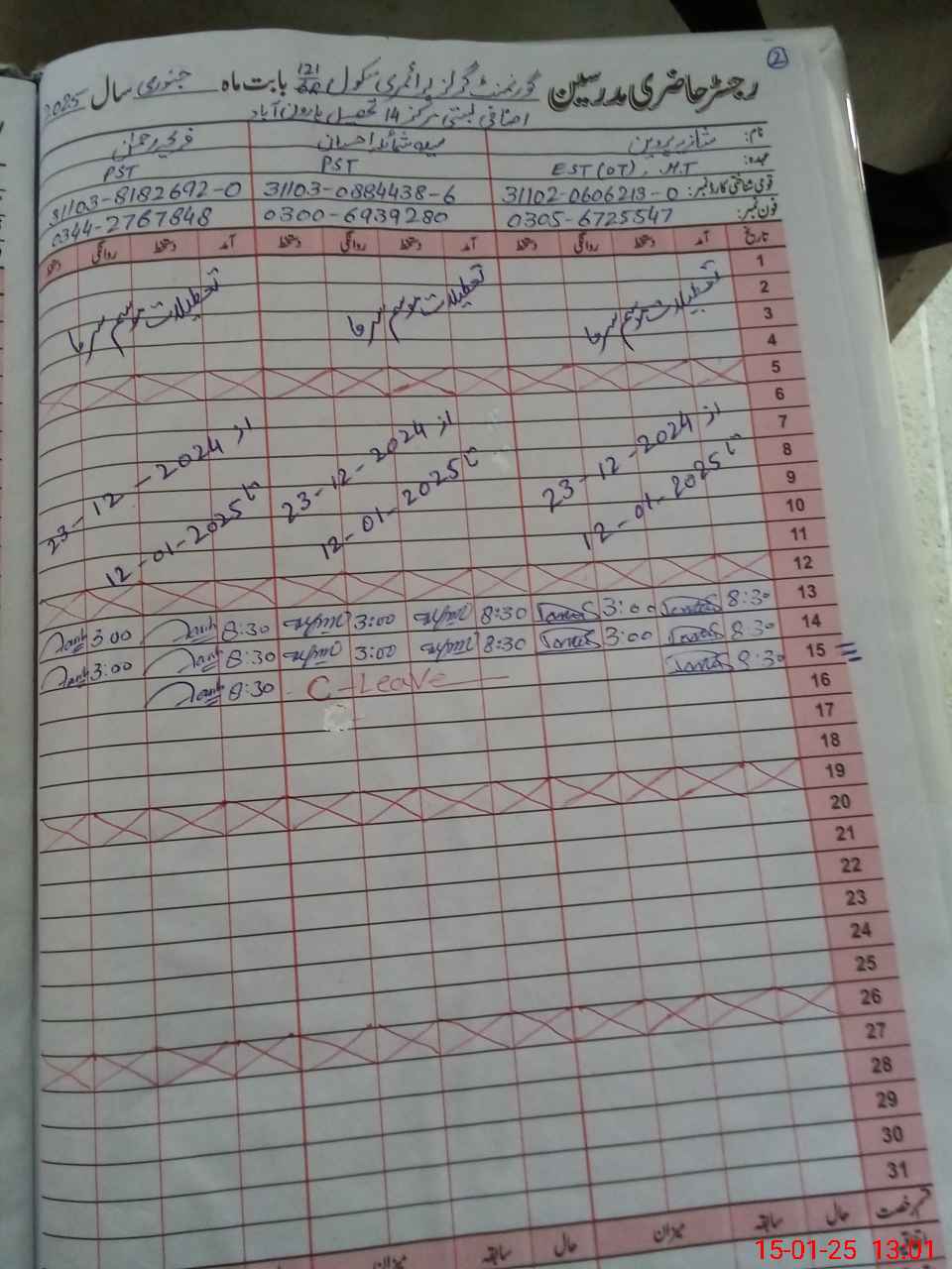 | CNIC | Full Name | Designation | R/C | Absence during last cal. month |