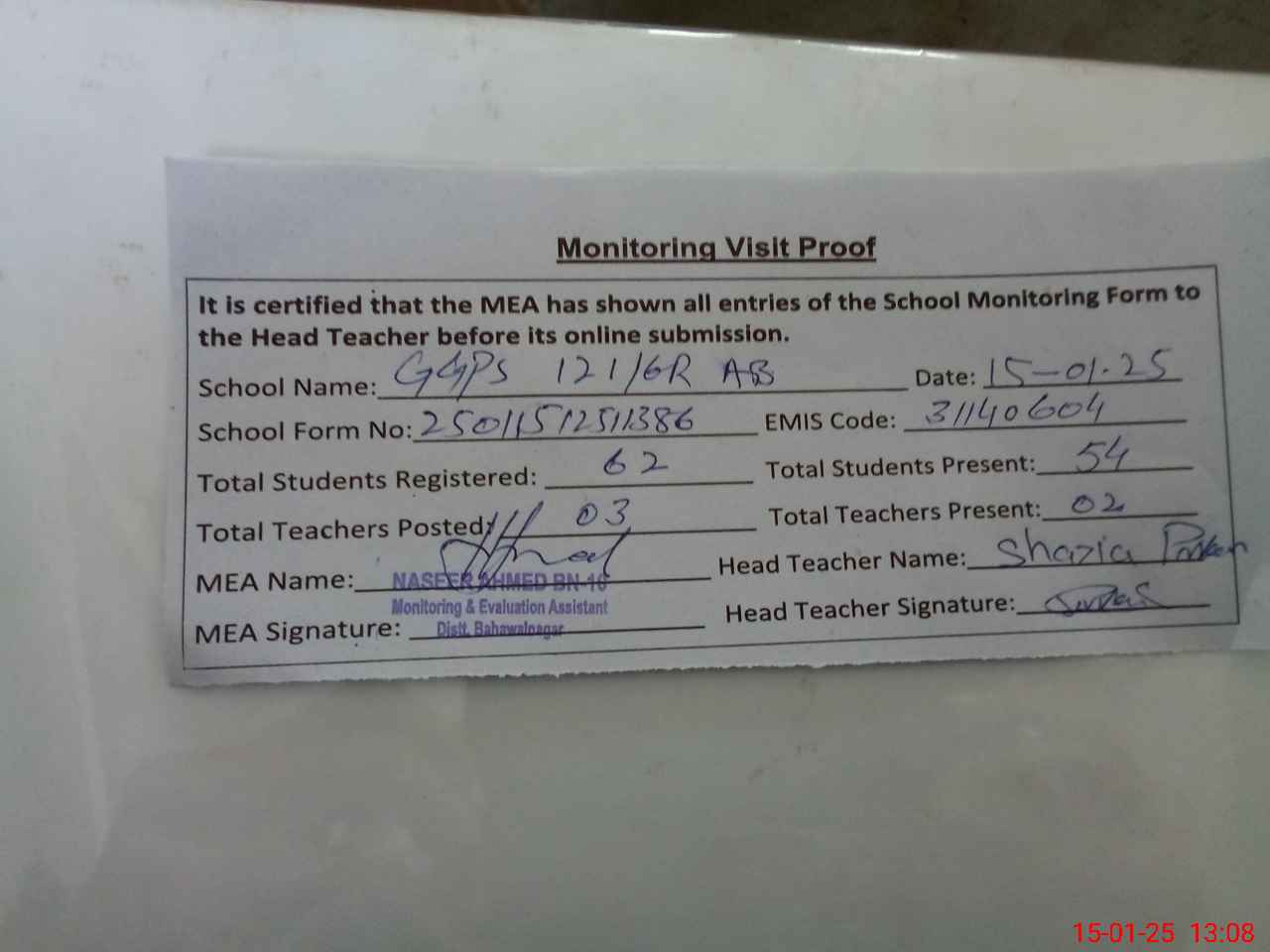 | Attendance Register | Head Teacher | MEA with School | Visit Proof |