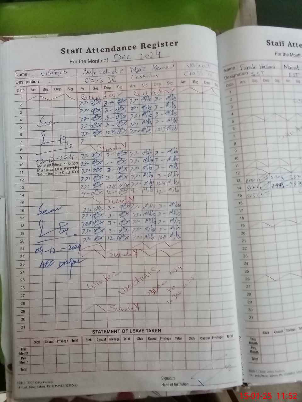 | CNIC | Full Name | Designation | R/C | Absence During Last Calender Month |