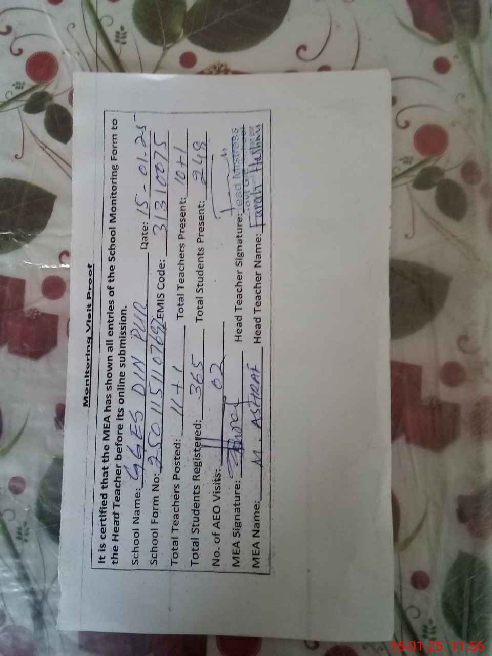 | Attendance Register | Head Teacher | MEA with School | Visit Proof |