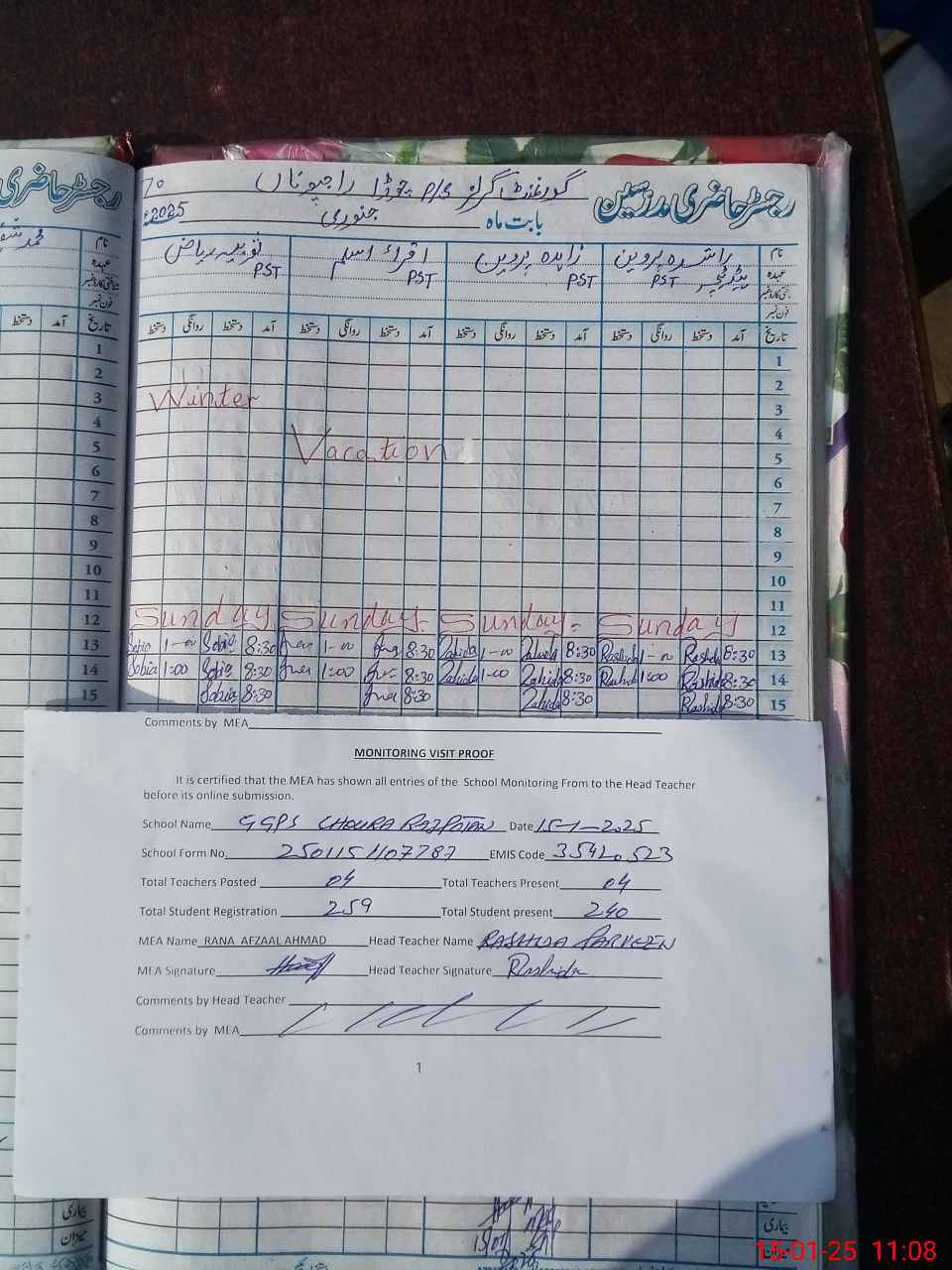 | Attendance Register | Head Teacher | MEA with School | Visit Proof |