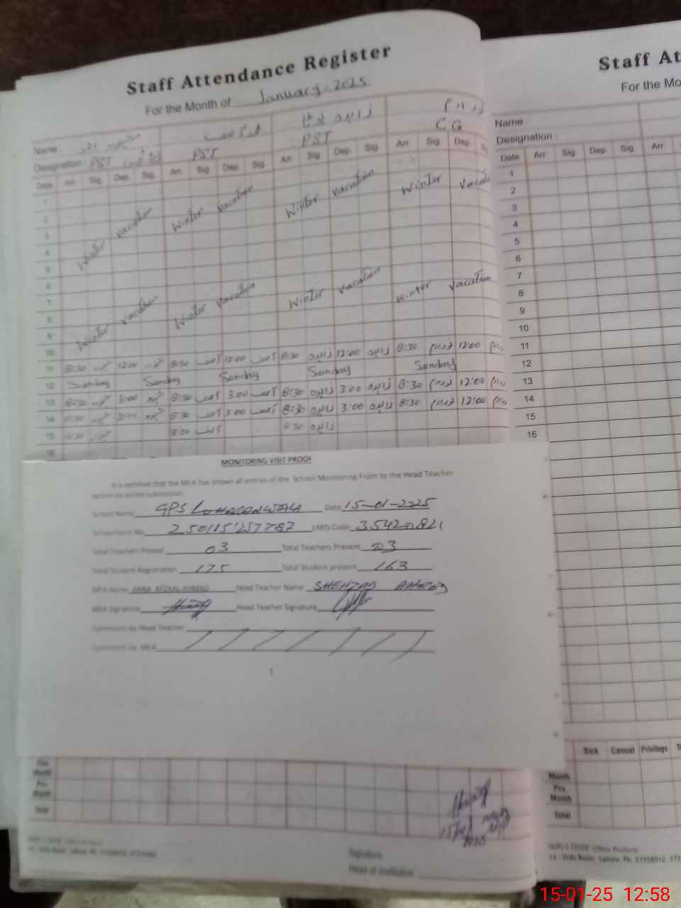 | Attendance Register | Head Teacher | MEA with School | Visit Proof |