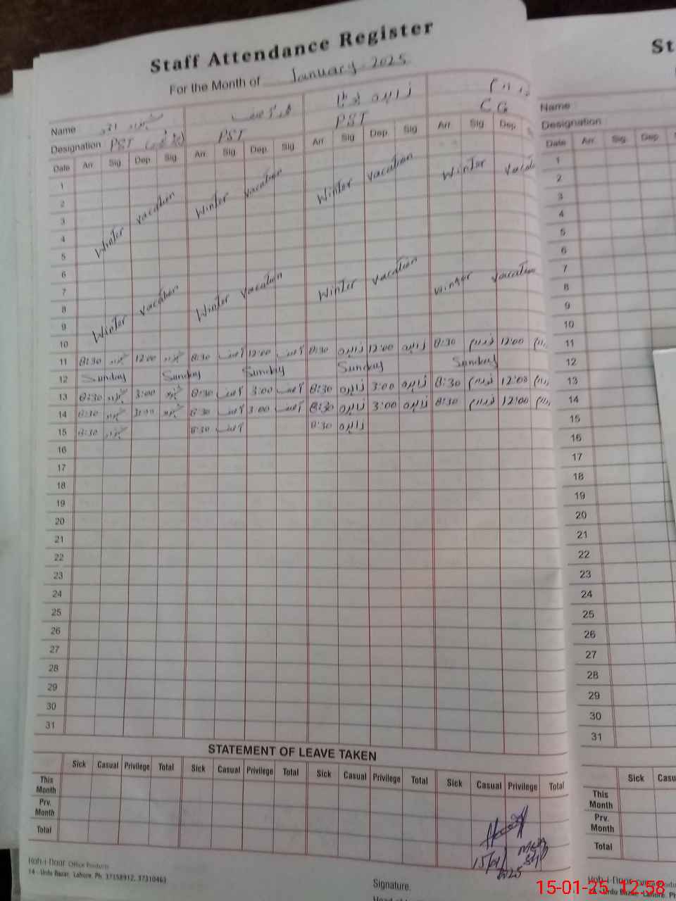 | CNIC | Full Name | Designation | R/C | Absence During Last Calender Month |