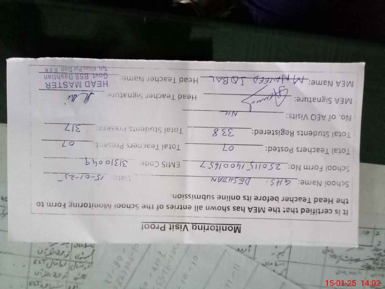 | Attendance Register | Head Teacher | MEA with School | Visit Proof |