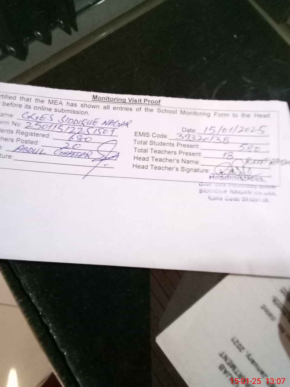| Attendance Register | Head Teacher | MEA with School | Visit Proof |