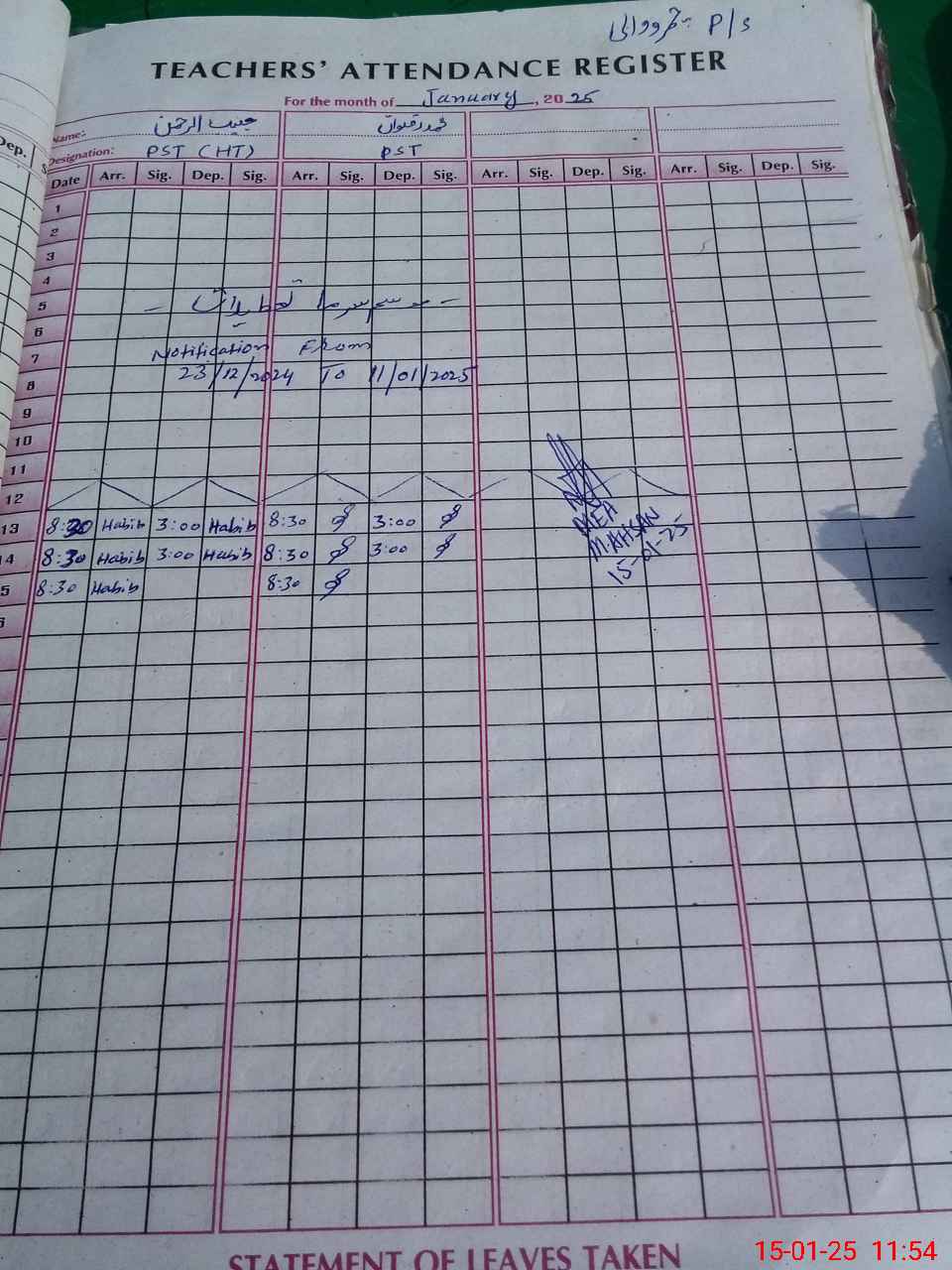 | CNIC | Full Name | Designation | R/C | Absence During Last Calender Month |