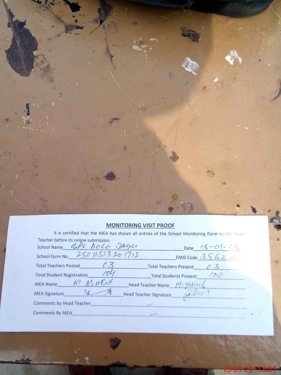 | Attendance Register | Head Teacher | MEA with School | Visit Proof |