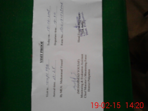 | School Visited by School Health & Nutrition Supervisor (No. of Visits) | 1 | Name1: | Waheed Anwar | Name2: | |