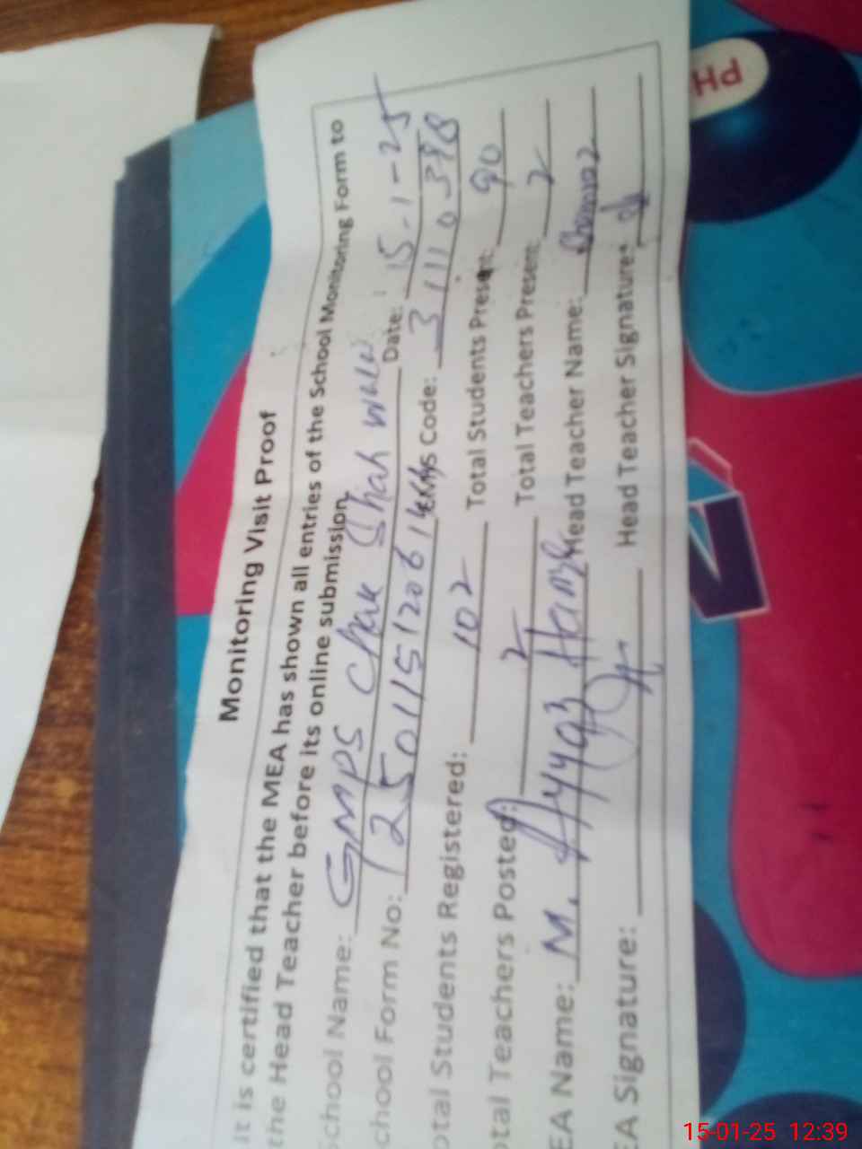 | Attendance Register | Head Teacher | MEA with School | Visit Proof |