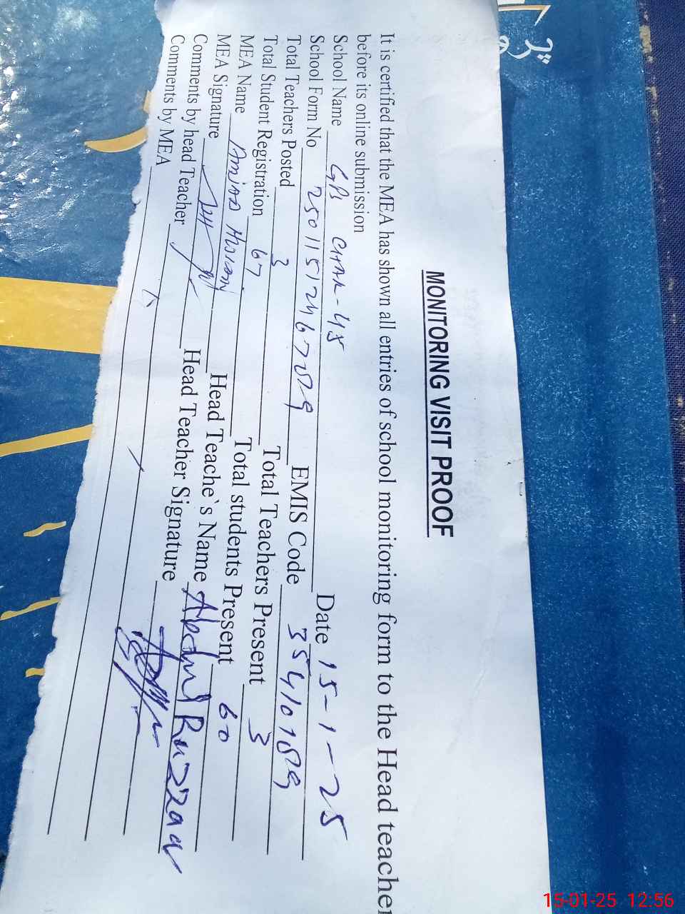 | Attendance Register | Head Teacher | MEA with School | Visit Proof |