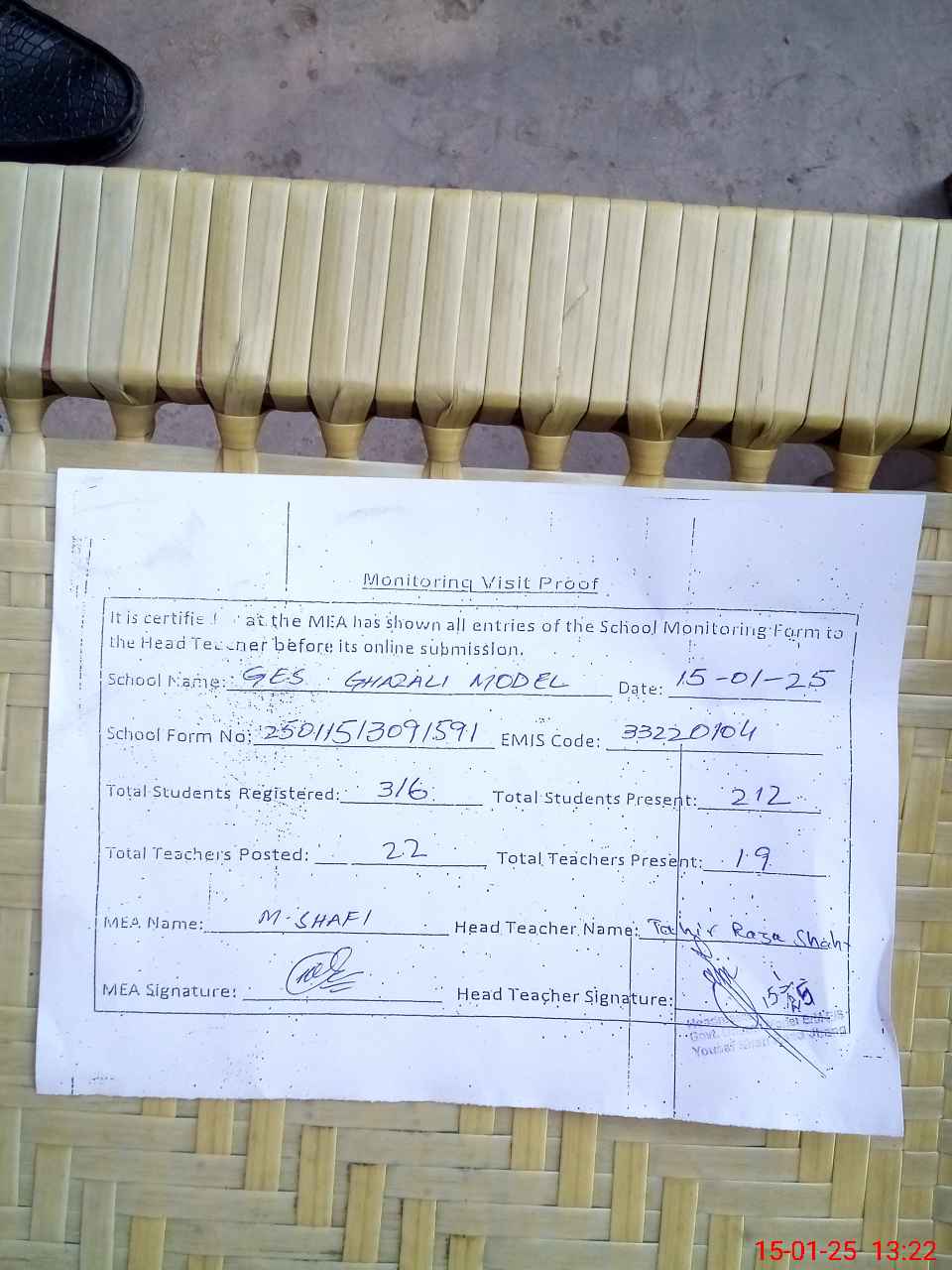 | Name: Sy**** Ta**** Ra**** Sh**** Designation: (School Headmaster's/Headmistress's) SST Phone/Cell Number: 03**** |
