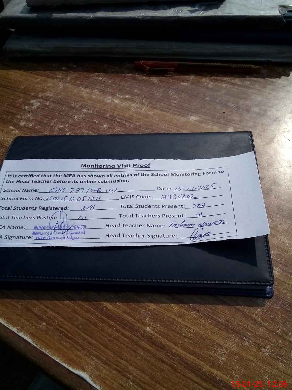 | Attendance Register | Head Teacher | MEA with School | Visit Proof |